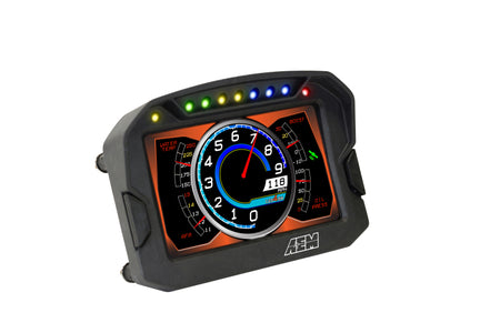 CD-5 Carbon Digital Dash Displays feature a full-color, daylight readable screen surrounded by a tough, lightweight flow-molded carbon fiber composite housing. Seven ultra-bright LEDs span the top of the display housing for RPM and shift light indication. Users can program them to ascend in specific increments based on RPM range and flash when it is time to shift. Brightness is user programmable on the fixed color LEDs. Two large buttons are included on the face of the display, allowing easy page changing and memory resetting even with driving gloves on. These button functions are included in the supplied rear connector, allowing the user to mount remote buttons. Two additional programmable LEDs are located above the toggle buttons on the top of the housing on either side of the integrated LED shift lights.VIEW AND LOG DATA FROM OVER 250 CAN DEVICES!