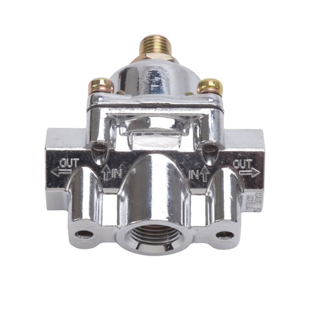 The Edelbrock Fuel Pressure Regulator #8190 is for carburetor applications that require consistent pressure from 4-1/2 to 9 psi. It features two 3/8" NPT outlets, one 3/8" NPT inlet, 1/8" NPT gauge port and is adjustable from 5 to 12 psi. This regulator is manufactured from billet aluminum and features a Nylon-reinforced Nitrile diaphragm for excellent heat and leak resistance.