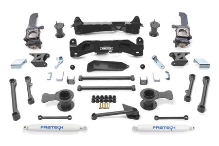 Fabtech's FJ system features extended length steering knuckles attaching to one piece lower control arm crossmembers for a full 6 inches of lift to clear 35'' tires. Front lower crossmembers feature adjustable alignment cams along with an integrated 1/4'' thick steel differential skid plate. The Basic system retains the front strut assembly for a smooth highway ride with ease of installation. The Basic rear suspension systems include tubular upper and lower link arms, utilizing the stock rear coil springs for a supple highway ride with excellent offroad articulation. Installation does not require relocation of the Rack and Pinion or disassembly of the front strut assemblies. The stock front and rear driveshafts are retained due to Fabtech's precise suspension geometry.