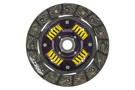 3000108 is a performance street disc and the most popular disc purchased. It features premium organic materials with high copper content for better heat transfer. Performance street discs allow for quicker shifting and smooth engagement. These discs feature a reduced marcel for faster shift action to complement ACT pressure plates. ACT spring-centered assemblies use bushings and cone springs similar to factory clutch discs. This creates frictional dampening, which improves clutch life and reduces noise. Quiet operation with increased strength and reliability.
