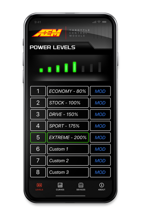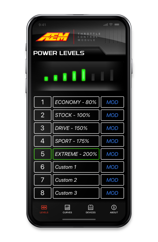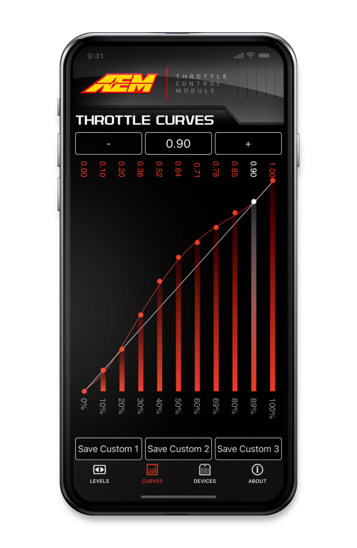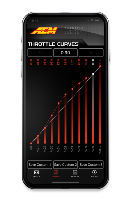 The AEM TCM (Throttle Control Module) instantly puts YOU in CONTROL. Get rid of laggy acceleration and dead pedal with an AEM TCM. Wirelessly program your own throttle curves with your Phone when using the AEM TCM APP. You can use one of 5 preset throttle curves or customize and save up to 3 of your own. Be in CONTROL and dial in your throttle curve just the way you want. Installation is plug & play through your accelerator pedal harness. Phone APP support will be for both Andriod and iOS. Our APP is user-friendly with intuitive functions to help you take CONTROL. More vehicle application support to come.