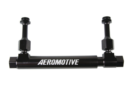 Billet, double adjustable, carburetor fuel logs for superior fitment. The advantage of a company that understands engineering, design, and manufacturing, is peace of mind. When you buy a fuel log from Aeromotive, you can be assured they will fit and deliver as promised. Threaded with 9/16? ? 24 ORB (o-ring boss) for proper sealing on carburetors like the Holley Ultra-HP and those with similar float bowls. Carburetor inlets swivel + or ? 20 degrees in all directions for optimum clearance from valve cover and intake runners. Telescoping center line is 7.700? to 13.450? adapts to standard and high capacity float bowls. ORB-10 inlet and outlet ports can be adapted from AN-12 to AN-06 with available Aeromotive ORB port fittings. Two 1/8? NPT ports for gauges and/or pressure transducers. 1.056/.806? ID bore for high flow capacity. Type II bright-dip black anodized finish for durability and great looks.