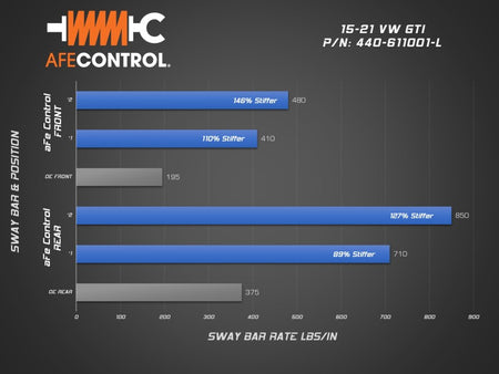 Transform your Volkswagen into a canyon carving machine with aFe CONTROL sway bars. With 2-way adjustability in the rear, you can easily dial in the handling balance and eliminate understeer. Body roll will be reduced, maximizing tire contact with the road. Sharpened steering response will improve initial turn-in making the car more agile and feel lighter. Our kit also includes adjustable, high articulating rear end links to replace the factory plastic units. The rear links are rather short, so higher articulating links are ideal for an adjustable sway bar. Whether its stability on the track, more rotation on the autocross, or just adding confidence in the canyon, aFe Control sway bars will deliver. Every aFe Control sway bar is CAD designed and CNC bent to strict tolerances. This insures precise fit and perfect operation. Our 2-way adjustable rear sway bar allows the driver to dial in the rear roll resistance to achieve the desired handling bias. The rear sway bar is equipped with laser cut arms. These are welded to the bar in a dedicated fixture to insure accurate hole positioning and consistent manufacturing. aFe Control’s end links use PTFE lined Aurora rod ends with high articulating studs and misalignment spacers. These are also length adjustable if you want to adjust out any static pre-load in the rear bar. aFe Control includes low-deflection polyurethane bushings and premium 6061-T6 aluminum black anodized billet brackets. The brackets are outfitted with grease fittings for easy maintenance