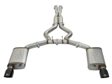 This cat-back exhaust system is constructed of 3 IN - 2-1/2 IN mandrel-bent brushed finished 304 stainless steel tubing for maximum strength and durability. This system features high-flow 304 stainless steel mufflers, producing a deep sound. Finishing off this exhaust system are quad 3-1/2 IN diameter black 304 stainless steel clamp-on exhaust tips. The tips features a laser etched aFe POWER logo for a unique style. This system produces a deep sound unleashing all available horsepower and torque. Utilizing a factory style flange and hangers this system is a direct bolt-on system, which requires no cutting or modifications for a hassle-free installation. This cat-back exhaust system uses a heavy duty flex pipe with an internal interlock liner for added strength and durability. A mitered merge x-pipe is used to balance and evenly distribute exhaust pulses traveling through the exhaust system, minimizing exhaust drone and maximizing scavenging. This system incorporates factory style exhaust valves which use the factory exhaust valve motors (not included). The valves help regulate, direct and control the flow of exhaust gases by opening, closing, or partially obstructing passageways depending on throttle position for maximum performance. State-of-the-art computer-aided design technology is utilized for precise vehicle fitment. 100% TIG-Welded for race-proven strength and durability.