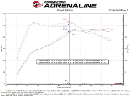 This aFe POWER Pro DRY S air filter is a 7-1/2” tall, oil-free, 360-degree conical flow performance air filter with three layers of synthetic media for maximum convenience. Its progressive layering provides great filtration efficiency and dust holding capacity, while not requiring the use of oils. This media is best suited for street and light off-road use. The sealed XLPE polymer housing features a rugged design, as well as a clear sight window, allowing for hassle-free filter inspection. aFe POWER's patent pending filter-to-housing interface eliminates the use of an overabundance of parts, further simplifying the installation process. The housing utilizes the factory air inlet, using no additional hardware, and features an optional auxiliary air inlet that pulls in additional air. This system features a high quality, computer-designed, dyno-tuned intake tube to achieve maximum power gains while maintaining a perfect fit. Its XLPE material is heat soak resistant and extremely durable. The computer designed system utilizes factory mounting locations, minimizing the use of unnecessary hardware and ensuring a perfect fit every time. Its innovative design makes for a hassle-free, direct bolt-on installation process that requires no cutting or drilling. Its revolutionary design, featuring our patent pending filter-to-housing interface, uses half the number of parts of a traditional cold air intake system.