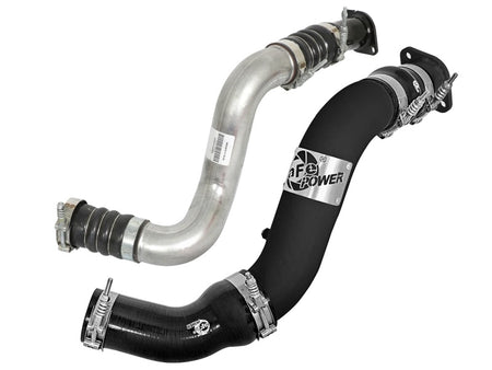 Flow and Performance: Constructed of 3" mandrel bent, powder-coated aluminum tubing for maximum flow. The smooth transition bends decrease turbulence and minimize pressure loss, increasing horsepower, torque and lowering EGT's. Installs on the Hot Side to transfer heated air smoothly to the intercooler to accelerate heat transfer for better performance. Perfect Fit: Utilizes the factory mounting locations to provide stability for a hassle-free installation. Includes high quality stainless steel spring loaded t-bolt clamps and heavy-duty 5-Ply couplings for strength. Fits OEM or aFe's upgraded intercooler (46-20281). aFe Badging: A unique stainless steel laser-cut aFe power logo plate is welded-on for an aggressive style