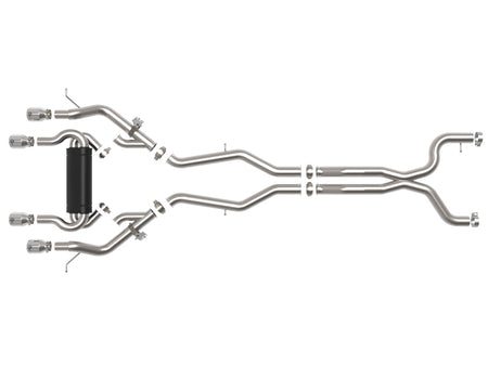 This cat-back exhaust system is constructed of 3 IN - 2-1/2 IN mandrel-bent 304 stainless steel tubing for maximum strength and durability. This system features a high-flow stainless steel muffler, producing an aggressive sound. Muffler finish may vary. Finishing off this exhaust system are quad 4 IN diameter polished 304 stainless steel clamp-on exhaust tips. The tips features a laser etched aFe POWER logo for a unique style. This system produces an aggressive sound unleashing all available horsepower and torque. Some cutting may be required, see instruction sheet for further information. Utilizing factory style hangers this system mounts directly to factory mounting locations for a hassle-free installation. A mitered merge x-pipe is used to balance and evenly distribute exhaust pulses traveling through the exhaust system, minimizing exhaust drone and maximizing scavenging. This system incorporates factory style exhaust valves which use the factory exhaust valve motors (not included). The valves help regulate, direct and control the flow of exhaust gases by opening, closing, or partially obstructing passageways depending on throttle position for maximum performance. State-of-the-art computer-aided design technology is utilized for precise vehicle fitment. 100% TIG-Welded for race-proven strength and durability.