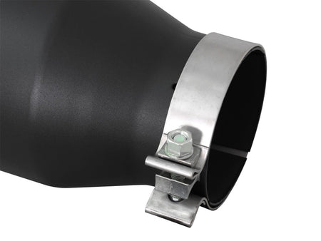 aFe Power is proud to introduce the all new diesel exhaust tip. This tip comes with a black finish and is designed to fit 4" exhaust systems. With a 4" inlet x 6" outlet and 15" inch length, this single-walled, angle cut rolled tip comes with a unique laser-cut aFe Power logo plate riveted on for an aggressive style. Leak-Free Seal: A high quality stainless steel band clamp is used for a complete 360 degree sealing surface. aFe Badging: The exhaust tip comes with a unique laser-cut aFe Power logo plate riveted on for an aggressive style.