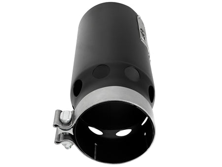 aFe Power is proud to introduce an all new intercooled exhaust tip. This tip comes with a black finish and is designed to fit 4" exhaust systems. With a 4" inlet x 5" outlet and 12" inch length, this single-walled, angle cut rolled tip comes with intercooling vents and a unique laser-cut aFe Power logo plate riveted on for an aggressive style. Intercooled Vents: This tip comes with intercooling vents designed to reduce exhaust gas temperatures at the tailpipe. Leak-Free Seal: A high quality stainless steel band clamp is used for a complete 360 degree sealing surface. aFe Badging: The exhaust tip comes with a unique laser-cut aFe Power logo plate riveted on for an aggressive style