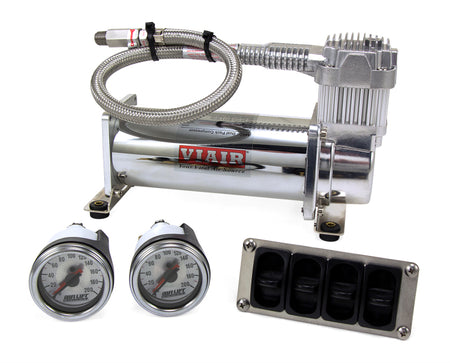 Air Lift Performance 4-Way Manual Air Management System. Economical, simple and accurate control for all 4 wheels. Great for use with gauge and pillar pods. The system provides a maximum pressure of 175 psi. Features a VIAIR 100% duty cycle 16444 Compressor 1/4 inch air line for accurate and smooth adjustment. Attractive stainless steel switch plate. This Kit Includes: Viair 444C Chrome Continuous Duty Compressor (200psi), 4 Gallon Aluminum Tank, Air Line, Two Dual-Needle Pressure Gauges, 4 Paddle Valves, Air Fittings and Air Line Cutter. Everything needed for installation.