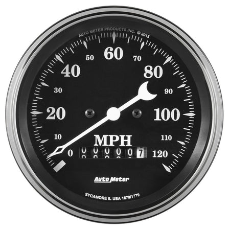Auto Meter Gauge Speedo. 3 3/8in 120mph Elec. Prog. w/ Wheel Odo Old Tyme Black