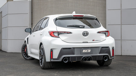 This 3" diameter Borla(r) Cat-Back(tm) system is designed specifically for the 1.6L engine in the GR Corolla. The system contains Borla(r)'s Polyphonic Harmonizer Technology which utilizes patented units that contain pipes of different diameters and lengths to create multiple exhaust notes that harmonize to deliver a clean, rich, full-bodied sound and the dual mufflers deliver the aggressive ATAK(r) sound with no drone. The system has an Active Exhaust Valve. It features 4 black coated T-304 stainless steel tips, 2) 3.5" round (center) tips and 2) 4.5" round (outer) tips. Systems with polished T-304 stainless steel tips, and carbon fiber tips are also available. Borla(r) Cat-Back(tm) & Axle-Back exhaust systems feature patented straight-through and multi-core technology to unleash hidden horsepower. Increased exhaust velocity adds power, driving excitement, fuel economy, and the distinctive Borla(r) Sound of Power respected by motoring enthusiasts everywhere. Each system is built from premium, high-quality T-304 austenitic stainless steel, superior to T-400 series knockoffs (such as 409), to give you the absolute best in performance and durability. Ultra-smooth mandrel bends ensure maximum flow & power, and precision computer numerical control (CNC) manufacturing ensures an accurate fit. Best of all, Borla(r) stands behind every system with a Million-Mile Warranty. Just what you'd expect from the world's most experienced (and most winning) exhaust brand. Give your GR Corolla the power and sound it deserves, bolt on a Borla(r).