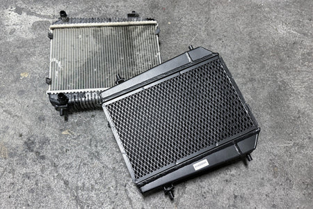 Compared to the OEM G8X coolers, the CSF units are a significant upgrade. The TIG welded aluminum tanks are much larger than the OE plastic tanks offering superior strength and fluid volume. A larger 2-row 42mm core increases cooling efficiency and capacity. This high efficiency core uses CSF's Exclusive B-Tube Technology and latest 5mm fin technology, maximizing airflow and heat dissipation. These 5mm fins significantly increase the heat exchange surface area improving overall cooling efficiency and recovery while still maintaining good airflow.