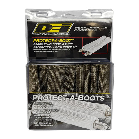 Titanium Protect-A-Boots are the latest in thermal protection technology for spark plug boot protectors. Developed from a unique material mined from lava rock, stranded and woven into a proprietary weave for added durability and strength yet is pliable enough to provide a universal fit for straight or angled boots. Titanium Protect-A-Boots are naturally resistant to heat, chemicals abrasions and contaminants, and are engineered to withstand temperatures up to 1800F (983C) of direct heat. High horsepower engine compartments are known for extreme heat that can put spark plug boots and wires at risk. With excessive heat generated from the exhaust manifold and headers the ignition system is vulnerable to the potential of burning, hardening and cracking of ignition wires and boots that could lead to arching, engine misfire and potential ignition system failure. Titanium Protect-A-Boots with LR technology, are engineered to handle extreme heat providing the ultimate protection for todays high voltage ignition systems for many applications including automotive, marine and powersports. The color and weave work together to give DEIs Titanium Protect-A-Boots a cool carbon fiber appearance that looks great under the hood - ideal for race, street, show cars and off road vehicles. Ultimate protection for spark plug boots and wires Withstands heat up to 1800F (983C). Our 6 in. Titanium Protect-A-Boots come with a reinforcement ring at the base for easy plug removal during maintenance. When working on boots with tight bends, try our 8 in. Titanium Protect-A-Boot XL Ringless instead. For thicker boots like MSD or Taylors we recommend our Protect-A-Boot Ringless Sleeves; the 1.25 in. diameter will allow for a simple install.Ultimate protection for spark plug boots & wires Non-flammable and protects against chemicals and resists water Double-wall construction for added durability Cool carbon fiber look Boots measure 6 in. L 2 boots per pack