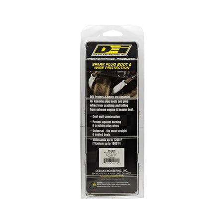 Titanium(TM) Protect-A-Sleeve solves the problem of burning, cracking plug wires, lines & hoses from engine & exhaust heat. DEI's Titanium Protect-A-Sleeve with LR Technology(TM) offers the best possible line sleeve protection on the market. Developed specifically for any application where extreme high heat is present, these Titanium sleeves will protect wires, lines and cables when exposed up to 1800°F direct heat/2500°F radiant. Developed with DEI's proprietary LR Technology, these high temperature rated sleeves provide superior thermal protection for street vehicles or race engines, protecting fuel, oil lines, spark plug and electrical wires from direct or under hood radiant heat. Water and heat resistant, they are also ideal for Powersports ATV/UTV, motorcycle, personal watercraft, snowmobiles, and marine use. The 1/2 in. ID sleeves will fit many of today's larger diameter spark plug wires for protection against hot exhaust manifolds and headers. Titanium Protect-A-Sleeve is also offered in 1 in. and 2 in. diameters. Constructed from high temperature resistant basalt fiber material Protects electrical wiring, speedometer cable, hoses & more 1/2 in. I.D. 4 Cylinder Kit Contains: 13 feet of sleeving & 12 Hi-Temp Boot Shrink Tubes