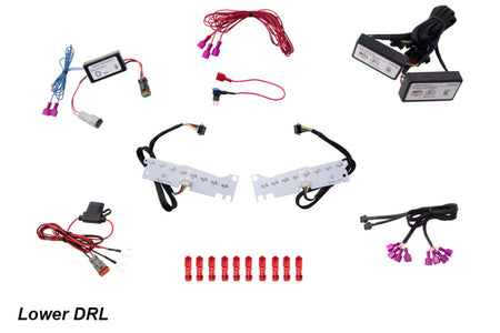 Features Adds multicolor function and amber turn signal (RGBWA only) to the upper and lower DRLs. Automatically switch to white while driving. Smartphone Bluetooth control. CAD-designed for perfect fitment. Engineered and assembled in USA. Overview OEM Style, Multicolor Function. This kit is compatible with Chevrolet Camaro which has white LED DRLs in the headlamps and lower DRL housing from the factory. By replacing the circuit boards inside with Diode Dynamics LED circuit boards, you can add full multicolor functionality, to seriously make your ride stand out! RGBW This product is not just RGB, it is RGBW! That means there is an extra LED chip that is specifically white in color, right next to the standard red, green, and blue LEDs. By using the included Bluetooth RGBW controller, you can activate and control the white chip independently of the colors. This provides a much more uniform, pure, and bright white color for everyday driving. One RGBW Bluetooth Controller will control both the upper and lower DRL boards simultaneously. DRL Override.The RGBWA LED boards have an optional DRL override feature which allows you to automatically switch the LEDs to a high-brightness White color. This means you can leave the LEDs set to an accent color of your choice, then automatically switch to White while driving. What's Included? RGBWA Upper or Lower DRLs: Two (2) sets of LED boards, lower Two (2) waterproof drivers Two (1) JST pigtails One (1) DRL Power Wire One (1) Add A Fuse Wire One (1) SolidState Relay Harness One (1) Battery Input Wire One (1) zip tie Ten (10) T-taps One (1) RGBW Bluetooth Controller
