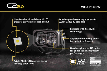 Overview. Introducing the Stage Series C2 2.0 LED Pod! The newly redesigned C2 2.0 packs even more power, light output, and versatility than the original C2 Pod. With its compact design, the C2 2.0 is a go-to for tight mounting spots. The new Max option delivers the highest output we’ve ever offered in a two-inch pod! Re-Engineered From the Inside Out. The C2 2.0 may look familiar, but under the hood, everything has changed. Dramatically improving thermal efficiency has resulted in higher power and light output. Choose Your Power Level. The C2 2.0 LED pod is now available in sport, pro, and max power levels. All options use high-intensity, automotive-grade LED emitters, and TIR optics for unmatched output. Focused Performance. Our patented TIR (Total Internal Reflection) optics in the C2 2.0 have been re-engineered for up to 120% more intensity and more usable light output compared to the C2 1.0. The TIR optics harness all of the light from the LED and direct it precisely where you need it. Each beam pattern has been fine-tuned for real-world conditions to perform even better than before. Backlight Functionality. These C2 2.0 LED Pods include a distinctive backlight feature, available in your choice of red or amber. The backlight fully illuminates the TIR optic, providing a unique and modern look. The red backlight is ideal for those looking to match OEM taillights or boost rear visibility, while the amber backlight is a great option for forward-facing applications to match OEM markers or add extra visibility. Customizable Mounting. The C2 2.0 LED pod features three mounting points to adjust the pod’s height. The revised mounting bracket also allows for even more adjustment to the angle of the pod for a more dialed-in setup.