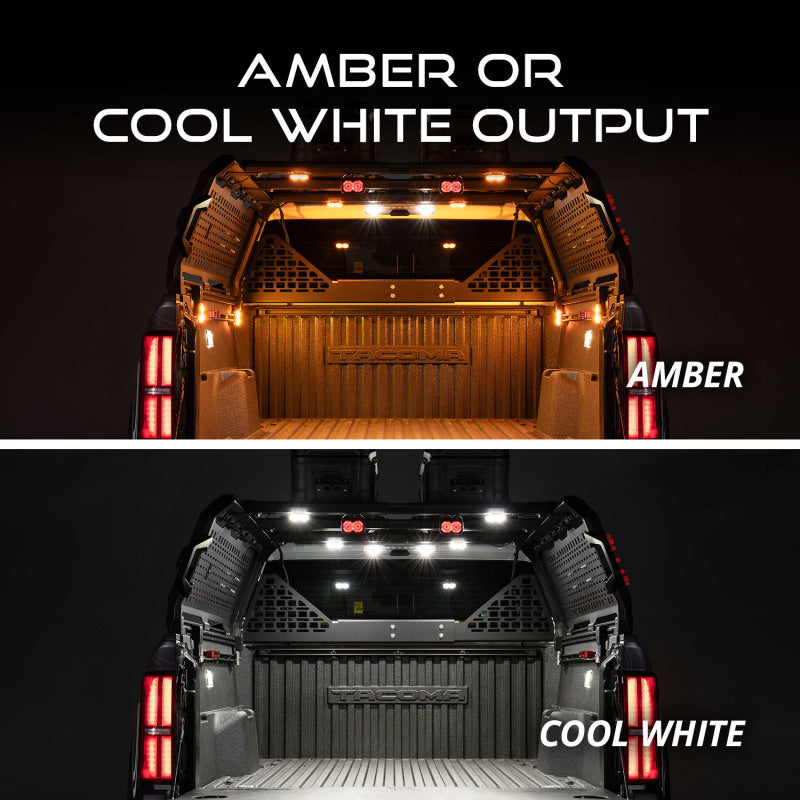 Features Allows you to mount four LED rock lights to the IBEX bed rack Significantly increased visibility with up to 4,000 lumen peak output Easily swap between cool white or amber output Seamlessly integrates with the crossbars for simple installation Engineered and Assembled in USA Overview Add significantly more light output to your truck bed at night with our Stage Series LED Bed Light Kit for the Kuat IBEX Bed Rack! This kit allows you to mount four Stage Series LED Rock Lights to the crossbars of your IBEX Bed Rack, giving you a huge increase in light output. Plus, you can easily swap between cool white and amber output thanks to the included lenses! With bolt-on installation and seamless integration, this kit is the perfect addition to any IBEX bed rack. Unmatched Light Output. By pairing optically engineered lenses with high-powered LEDs, the Stage Series Rock Lights included in this kit provide a significant increase in output. Choose Your Color This kit includes four White Diffused lenses and four Amber lenses, allowing you to choose the best color option for your vehicle. Whether you want a crisp, cool white light for maximum visibility or a softer amber to reduce glare, you can easily switch between lens options to suit your needs. Seamless Integration. The included T-Slot Nuts allow you to easily mount each rock light along the crossbars of the Kuat IBEX bed rack with a seamless appearance. The T-Taps allows you to connect to the factory bed light wiring, for simple everyday operation. Proven Reliability. We know that your bed lights will be put to the test, so you can rest assured that they have been designed for superior durability and extensively tested for long-term operation.