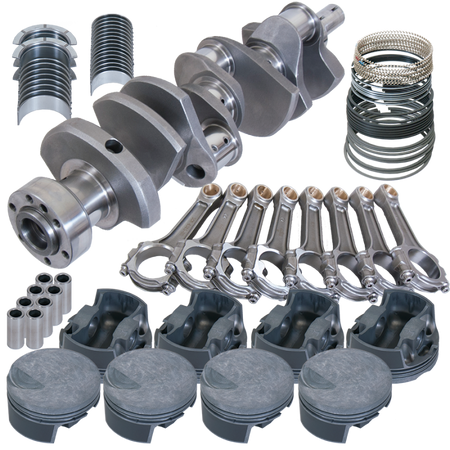 4.250" Cast Crank, 6.385" I-BEAM Rods,7/16" ARP 8740 BOLTS, Forged 4032 MAHLE -3CC FLAT TOP 4.310" PISTONS, PLASMA-MOLY FILE-FIT RINGS,KING SI Rod/MAIN BEARINGS.