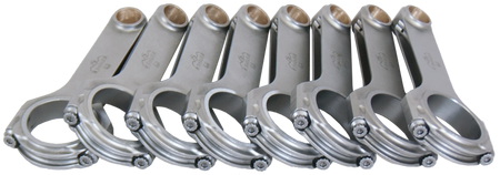 Eagle's 4th Generation H-Beam rods are forged from ASME certified 4340 steel in a two-piece forging and feature a fully machined and shot-peened surface. Eagle's 4th Generation design features thicker beam webbing for increased power handling capabilities, Increased beam and cap contact area and shoulder area to inprove bore stability under high load, and new small end profile to reduce reciprocating weight. Sizing is held to exact tolerances. Sold as a weight-matched set. Equipped with ARP 2000 bolts. Recommended for competition use.