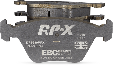 RP-X(TM) Racing Front Brake Pads by EBC(R). EBC Racings RP-X compound is an ultra-high performance track and race pad designed for performance vehicles driven hard on track and for dedicated race cars. RP-X has a very stable friction coefficient of 0.55 mu up to and beyond 850 C, making it an excellent performer for even the most demanding vehicle applications.