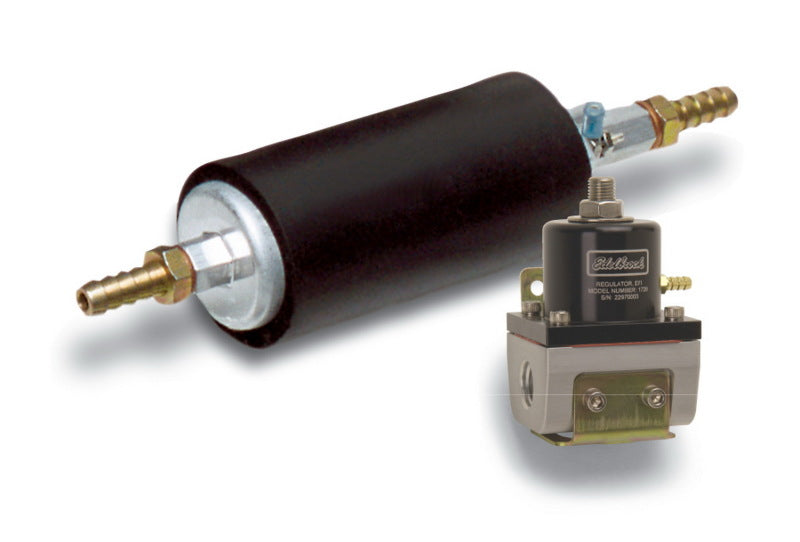 Edelbrock part #35943 kit will include the in-line electric fuel pump #3594 which provides 67 GPH at 43.5 psi and the #1728 Fuel pressure regulator. The fuel pump will include mounting hardware and it will come with 3/8 barbed fittings. Russell fittings allow the customer to use ?6 AN fitting (Russell part #670470) if desired. This kit will support up to 670 horsepower @ 43.5 psi.