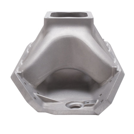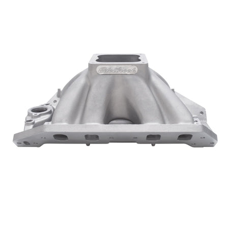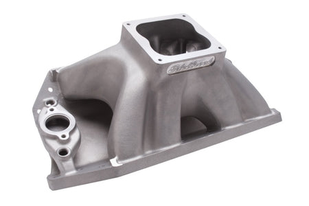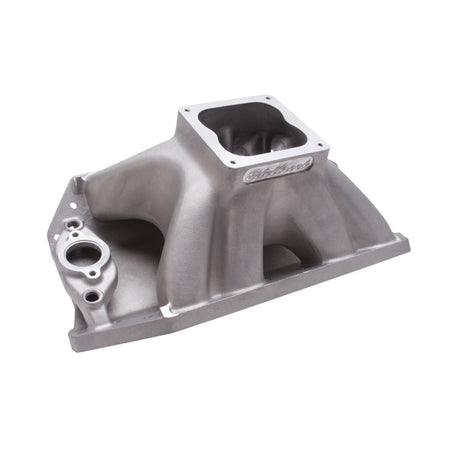 Edelbrock part #28002 Big Victor 2 Spread-Port Tall-Deck intake manifold is designed for large cubic-inch or high rpm drag racing big-blocks with Edelbrock Big Victor, Dart Big Chief or Brodix Big Duke cylinder heads, this manifold has an average runner area of approximately 4.75 sq. in. The port exits have been reduced to accommodate the wide variety of intake port sizes and require port matching. The runners have a minimum corner radius of .500" from the plenum to the exit allowing the popular oval port shape to be used. The outside runners are shorter and straighter than competitor's manifolds and the plenum is longer front to back. These features, combined with approximately 5% taper in runner cross-sectional area, give better top end horsepower while maintaining consistency and throttle response off the stop. All applications are equipped with a 4500 Series flange and will accept 2.25" throttle body butterflies without a spacer or modification.