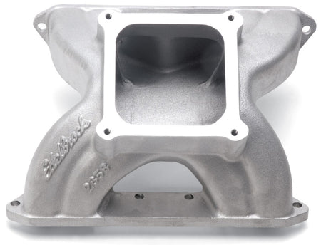 Edelbrock part #2858 Victor Glidden Spider intake manifold is intended for 375 c.i.d and up high output drag race engines. This manifold was developed in conjunction with noted drag racer Billy Glidden and is specifically designed to complement the flow characteristics of fully ported 18-degree and 15-degree cylinder heads. It features a 4500 series carb flange, and the dividers are pulled back to increase plenum size and shorten the runners for improved high rpm performance. The runners are wider at the plenum, producing approximately 3.6 square inches area at the opening. The Edelbrock Victor Glidden Spider is a single-plane, high-rise intake designed for maximum race-winning power at higher engine speeds.