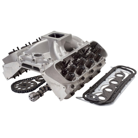 Edelbrock part #2094 Performer RPM Top End Kit is designed for 1996 & later Big-Block Chevy 502 V-8 engines. This Top End Kit produced 611 HP & 573 TQ on a 502 c.i.d engine with 9.6:1 compression. The kit delivers improved performance in street applications from 1,500 to 6,500 rpm range. The kit includes Victor Jr. intake manifold, Victor Jr. cylinder heads, pushrods and Rollin' Thunder Hydraulic Roller camshaft, timing chain, complete bolt kits and an Edelbrock gasket set. To get great performance out of any engine, all of the components must work together. For over 30 years, the Edelbrock Total Power Package system has solved the parts matching puzzle for many street performance enthusiasts. With the introduction our Power Package Top End Kits, now you can get the best Edelbrock performance in-one-box, under one part number with "no guesswork" involved.