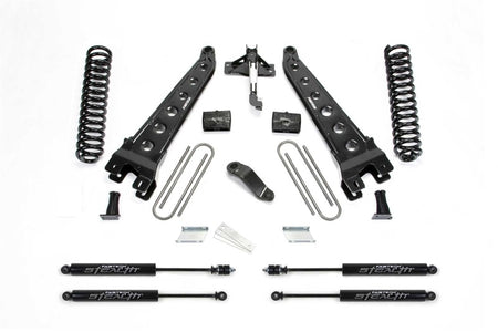 Fabtech?s 6" Radius Arm lift kit for the Ford F450 and F550 Super Duty is built to handle the on and offroad demands of the truck enthusiast. This vehicle?s suspension is more robust than the Ford F250 and F350 and therefore demands specialty parts only available from Fabtech. This Radius Arm system is a complete upgrade to the factory suspension and will provide additional strength for use with oversized tires. The design has been proven in over 10 years of service in consumer, commercial and military applications. High quality components with properly designed suspension geometry is what sets this system apart from all other Radius Arm suspensions. Each Fabtech component has been designed with specific features and benefits that create this quality suspension system. For a greater understand of each these components please see below. FEATURES: RADIUS ARM - Tubular construction with dimple die side plate for superior strength. Arms are offset to allow for full turning radius of the Dana Super 60 front axle with wide tires. Fabtech Radius Arms have 1 degree of caster built in for the increased ride height. Adjustable alignment cams on the Arms allow for an additional 1.5-2 degrees of caster adjustment. COIL SPRINGS - American made coil springs have been designed for a very compliant ride quality both on and offroad. Each coil is preset during the manufacturing process to insure no ride height settling over time. Allows for a 2" increase in wheel travel over stock when used with Fabtech shock absorbers. TRACK BAR BRACKET - 1/4" thick steel bracketry repositions the factory track bar to center the axle under the vehicle with the increased lift height. Super stout box style bracket is designed to eliminate deflection when the track bar moves through its full cycle. DROPPED PITMAN ARM - Forged steel construction with high strength material that exceeds the factory specifications. Designed specifically for the F450 and F550 to work in conjunction with the factory
