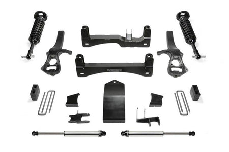 The Chevy Trail Boss and GMC AT4 both have a factory 2in lift compared to other GM 1500 trucks of the same year model. Fabtech's suspension system for these two trucks provide a 4in lift height on top of the factory 2in lift for clearance of 35in tall tires. Once a Trail Boss or AT4 is lifted with a Fabtech 4in system, the truck will sit at the same height as a 1500 with a 6in suspension and 35in tires. The near stock track width keeps the tires under the fenders for a clean appearance. Fabtech's proprietary steering knuckle geometry provides excellent lock to lock turning radius to maneuver in tight spots. Heavy duty 1/4in thick steel crossmembers feature OE style alignment cam pins that utilize the factory cams for easy adjustment. Triple front diff mounts reposition the differential for vibration free operation at high speed. The stainless steel Dirt Logic 2.5 Coilovers replace the Trail Boss or AT4 coilover with an outstanding ride quality both on and offroad. They are designed for aggressive offroad use yet have a supple on road feel. Rear Dirt Logic 2.25 shocks aid in damping the vehicle for a balanced ride. Rear lift is accomplished by removing the factory 2in block and replacing it with a 5in block and u-bolt system. Fabtech has addressed all aspects of the Trail Boss suspension for full suspension travel with lock to lock steering without over cycling. Comes with a free 5 year 60,000 mile Powertrain Warranty. CROSSMEMBERS: 1/4in thick steel lower control arm Crossmembers are arched for maximum ground clearance. The welded box design of these Crossmembers provides additional strength to the front suspension. Retains factory alignment cams for easy adjustment. STEERING KNUCKLES: Fabtech's extended length ductile iron Steering Knuckles provide zero bump steer throughout the suspension travel. This provides an enhanced driver experience compared to stock. Near stock track width keeps the tires under the fenders for a clean appearance. TIE RODS: Oversized tie ro