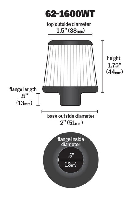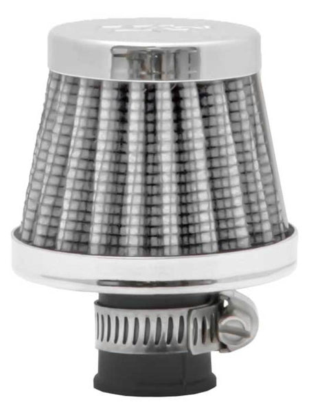 K&N crankcase vent filters are perfect for racing applications, vintage cars or individuals who want to add some aesthetics to their classic carbureted engine. The cone-shaped 62-1600WT crankcase vent filter has a K&N embossed chrome top and chrome base. The flange clamps directly onto a 3/8 to 1/2 inch metal or plastic tubing where venting is needed. Constructed with a white colored synthetic media it can be cleaned and reused repeatedly. Note: Legal in California only for racing vehicles which may never be used, registered, or licensed for use upon a highway. See knfilters.com for CARB status on each part for a specific vehicle.