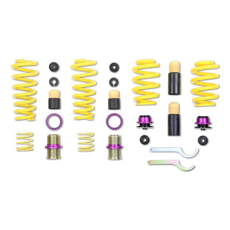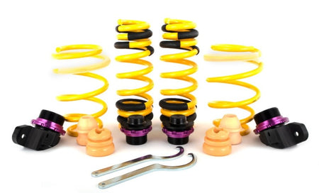 KW (H.A.S) Height Adjustable Spring kits are a great alternative to conventional lowering springs. You are no longer stuck with a fixed lowering height. KW H.A.S. systems allow you to adjust the vehicle ride height with the KW height adjuster even after the kit has been installed. Your vehicle not only gets a more dynamic look, but also the steering behavior and response of the standard dampers becomes more agile. All driver assistance systems and comfort features of a factory adaptive or electronic suspension remain operational and work harmoniously with our vehicle specific spring set up. KW uses high-quality springs made of chrome-silicon steel with spring rates designed specifically for each respective OE suspension damper and wheel load. KW's expertise and engineering ensure the spring rates will pair perfectly with the different damper characteristics of your factory adaptive electronic suspension. Along with the use of high quality materials and the included KW ride height Adjustment - mechanisms, our KW H.A.S. kits always includes the vehicle-specific bump stops with dust protection system to protect your factory suspension against wear & tear caused by road grime and debris. Similar to a coilover suspension, the KW H.A.S kit allow a continuous adjustable ride height within a tested range, something not possible with conventional lowering springs. The dust protection elements and spring perches included in the delivery, when applicable, are always adjusted to the maximum technically possible lowering, typically limited by the factory dampers. With KW height adjustable springs, a sporty and harmonious driving behavior can be achieved without the driving dynamics of performance-oriented vehicles suffering. As with all KW suspension products our engineers develop vehicle specific parameters and spring specifications which undergo comprehensive testing on the Nurburgring Nordschleife and in our KW 7-post Driving Dynamic Test Center.