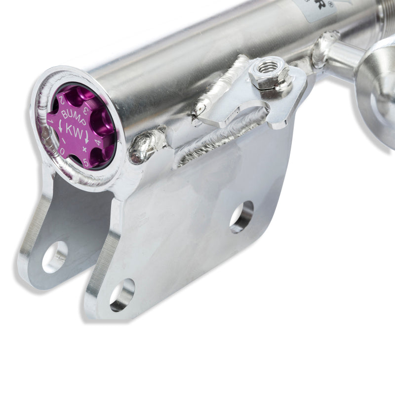 Cutting-edge motorsports technology for more performance on the road. Like every suspension product developed by KW automotive, the suspension manufacturer, and manufactured in Germany, the KW V3 Coilover suspension kit also provides a significant plus in safety reserves in road traffic. Thanks to the chassis with its high-quality dampers, springs, and elastomer spring elements, pitching and rolling movements during load changes such as evasive maneuvers, cornering, acceleration, and braking are significantly reduced. The braking distances are also shortened. Thanks to improved support and feedback, drivers not only feel safer but driving in everyday life becomes even safer. With compression and rebound stage damping, that can be set separately and independently of each other, the damper setup can be customized to your personal driving preferences or vehicle changes such as weight, tire characteristics, or altered vehicle rigidity. True performance optimization is only possible with this unique, patented system. For example, this allows the compression damping force to be increased and get more grip from the tires, to improve cornering behavior and reduce squat without simultaneously altering the rebound stage damping which is optimally matched to the spring rate, a scenario which results in reduced grip and the associated loss of performance. The KW V3 coilover kit is the ideal tool for performance-oriented drivers and experienced tuning enthusiasts who place a strong emphasis on the overall performance of their suspension. The Variant 3 features patented TVR-A and TVC-A technology that provides separately adjustable rebound and compression damping. The extensive adjustment range of the independently configurable rebound and compression make it easy to directly influence the steering behavior, directional stability, grip and handling characteristics for confident and repeatable results at the limit of driving dynamics.