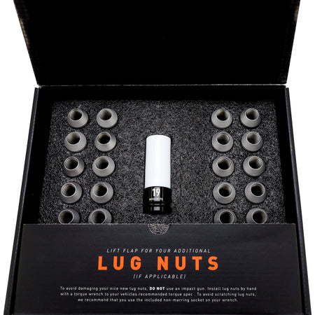 Lock down your wheels with confidence. The Mishimoto Steel Locking Lug Nut 24-piece Kit features a one-piece design that eliminates the common failure points of two-piece lug nuts. Each lug nut is built from high-strength steel to resist swelling, cracking, and impact stress over time.This kit includes 16 standard lug nuts and 4 locking nuts, secured with a 7-point, non-marring locking tool to protect your wheels without damaging the finish. The 19mm hex size fits a wide range of aftermarket wheels, and the open-ended design accommodates extended studs. Available in black or silver, this kit is backed by the Mishimoto Lifetime Warranty to keep your wheels stylish and secure for the long run.