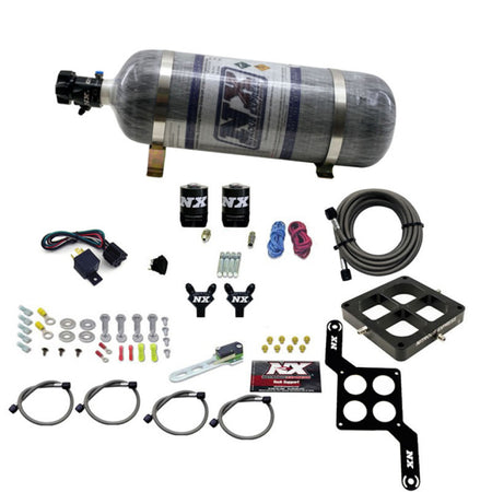 The new NX Billet Crossbar nitrous plate systems have just raised the bar in nitrous plate technology. The CNC machined design eliminates round spray bars resulting in excellent atomization and cylinder distribution. With no spray bars to sag, rotate or disrupt airflow, this is truly the Next Generation in cross bar nitrous plate technology. This system includes a 12lb composite nitrous bottle with the billet aluminum Lightning 45 bottle valve. This valve not only looks great; It is packed with features including two integrated gauge ports, 5/8 siphon tube, a large .325 orifice and an improved flow path with only one 45 degree turn. The Lightning 45 bottle valve looks great, flows great and weighs nearly one full pound less than our old style brass valve. This crossbar nitrous system includes more than the standard crossbar nitrous kit. It includes a custom solenoid bracket, billet aluminum y fittings, braided stainless solenoid to plate lines, nickel plated fittings, wide open throttle switch, master arming switch, 40 Amp relay and relay harness. This system is designed for DOMINATOR flange manifolds and includes jetting for 50, 100, 150, 200, 250 & 300HP.