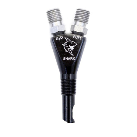 The Shark Nozzle features a Billet Aluminum body anodized in Black. The body itself features 1/8npt threads, a 90 degree discharge, as well as Stainless-Steel jet fittings. The patented Shark Nozzle has a maximum flow of 250 horsepower and ensures excellent atomization for the ultimate in horsepower production and reliability.