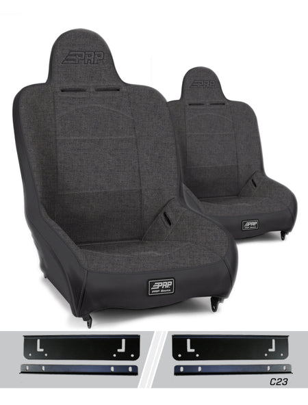 Add more comfort and containment to your Jeep Wrangler TJ. With 7" of containment, the Premier is PRP's versatile, all-around, off-road suspension seat. A great classic seat for Jeeps, buggies, trail rigs, and prerunners. Medium level containment on the sides keeps you secure when the ride gets rough, but still makes it easy to get in & out of the vehicle. The vinyl-coated nylon suspension liner and dual-density foam decrease the impact on the body, reducing the fatigue you feel after a long day in the dirt or dunes. The seat features Tweed Center, Vinyl Back and Vinyl Piping. This kit comes with 2x Premier Seats, and the adapter mounts to fit into your Jeep Wrangler TJ (1997-2002). The adapter mounts bolt to your OEM sliders, allowing you to install the seat while retaining the ability to slide back and forth. Seat Dimensions: 31? Tall x 21? Wide x 26? Deep Fitment Jeep Wrangler TJ (1997-2002) Note: *Seat height is typically 2" higher than stock seats. Made for Off-Road use only with 4pt or 5pt off-road harnesses. Passenger Seats may not retain the ability to tumble. 3pt Seat Belts will need a Seat Belt Extension/Angle Bracket.