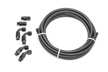8AN PTFE hose and hose-end fittings. 14.7 feet of hose (4.5m). Two straight hose ends, two 90 degree hose ends and two 45 degree hose ends. This PTFE-core hose is compatible with all types of automotive fluids including E85, gasoline, oil, power steering fluid, brake fluid, coolant, etc. Assembly is required. Correctly assembled hoses have been tested to over 1200psi. Carbon lines hose to dissipate possible static charge build up.