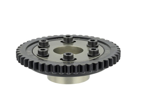 An engine's camshafts must be set at their proper positions relative to the crankshaft in order to maximize horsepower. The Pro Series Exhaust Cam Gear for Hondas K-series engines enables serious tuners to optimize horsepower and torque by being able to further adjust camshaft timing, allowing them to tailor the power curve appropriately. Thanks to laser-etched timing and directional marks, precise camshaft adjustments can be made quickly and easily. Pro Series Cam Gears feature precision-machined, hard-anodized steel teeth to reduce premature wear with a signature, six-bolt design that eliminates gear slipping. Skunk2's lightweight design and CNC-machined, 7075-T6 billet aluminum construction reduces rotational inertia, resulting in increased engine response and acceleration. Skunk2's adjustable cam gears have also been proven on race cars in the most extreme conditions for more than a decade.