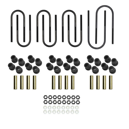 High-quality polyurethane bushings / sleeves deliver a quiet, consistent, controlled, stable, and smooth riding experience. High-quality u-bolts are black e-coated to provide an extremely durable protective barrier to prevent corrosion. Complete with high-quality grade mounting hardware.