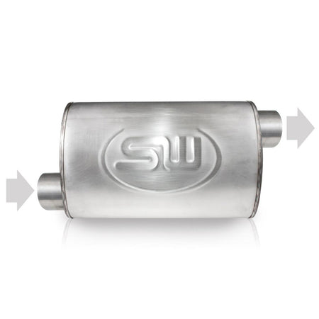 Turbo Chambered muffler, Made from 304 stainless steel for maximum corrosion resistance. This muffler has 2-1/4" ID offset inlet and a 2-1/4" OD offset outlet opposite side with a 2-1/4" core and shell size 5" x 9" x 14" with an overall length of 18" with a mill finish. Stainless Works is the only manufacturer to make the body, core, and packing out of 304 stainless steel. Exclusive louvered core creates a sweet "Street Rod" deep tone that is very aggressive. These are TIG welded for strength and durability. These kits come with a lifetime warranty and proudly made in the USA.
