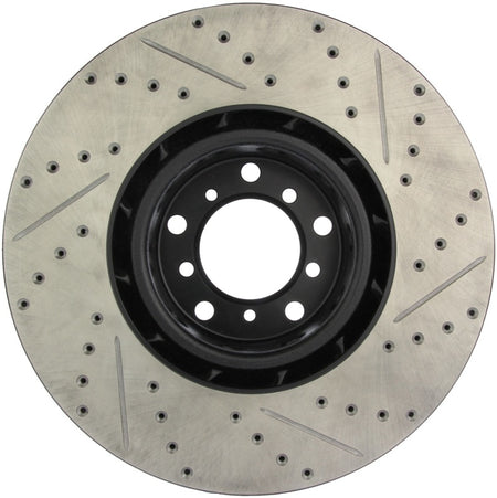 StopTech Drilled and Slotted Sport Rotors are 1-piece direct replacement brake discs for factory brake systems and stock calipers that look great behind your wheels – and offer significantly improved braking performance. The unique cross-drilling and slotting aids with heat and brake dust dispersal; prevents glazing of the pads; adds bite and improves wet and dry braking performance. Built to last; the black e-coating provides protection from corrosion and the high carbon metallurgy (in most applications) offers quieter operation; better crack resistance and increased performance.