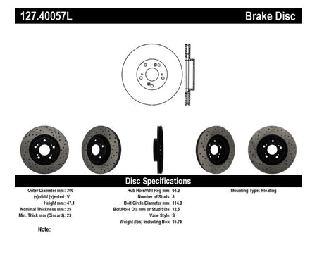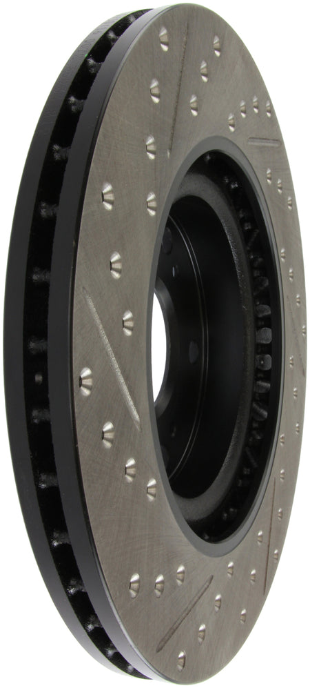 StopTech Drilled and Slotted Sport Rotors are 1-piece direct replacement brake discs for factory brake systems and stock calipers that look great behind your wheels – and offer significantly improved braking performance. The unique cross-drilling and slotting aids with heat and brake dust dispersal; prevents glazing of the pads; adds bite and improves wet and dry braking performance. Built to last; the black e-coating provides protection from corrosion and the high carbon metallurgy (in most applications) offers quieter operation; better crack resistance and increased performance.
