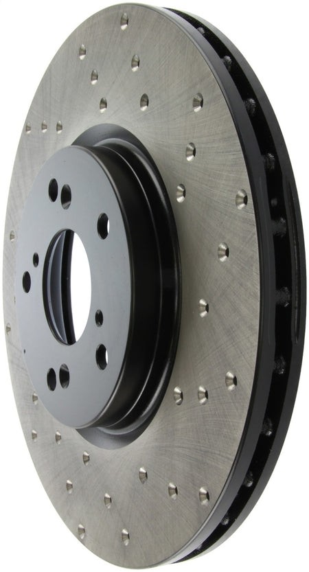 StopTech Drilled Sport Rotors are 1-piece direct replacement brake discs for factory brake systems and stock calipers that look great behind your wheels – and offer significantly improved braking performance. The unique cross-drilling aids with heat and brake dust dispersal; prevents glazing of the pads; adds bite and improves wet and dry braking performance. Built to last; the black e-coating provides protection from corrosion and the high carbon metallurgy (in most applications) offers quieter operation; better crack resistance and increased performance.