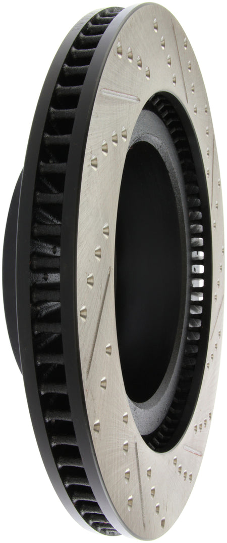 StopTech Drilled and Slotted Sport Rotors are 1-piece direct replacement brake discs for factory brake systems and stock calipers that look great behind your wheels – and offer significantly improved braking performance. The unique cross-drilling and slotting aids with heat and brake dust dispersal; prevents glazing of the pads; adds bite and improves wet and dry braking performance. Built to last; the black e-coating provides protection from corrosion and the high carbon metallurgy (in most applications) offers quieter operation; better crack resistance and increased performance.