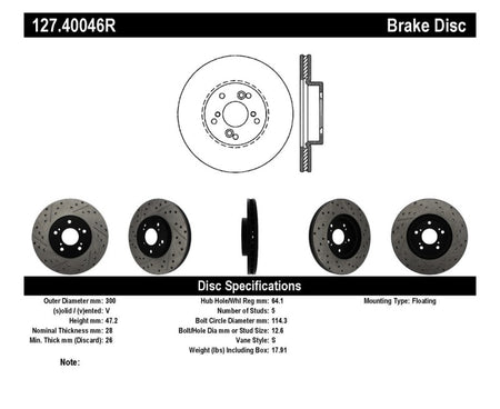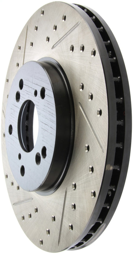 StopTech Drilled and Slotted Sport Rotors are 1-piece direct replacement brake discs for factory brake systems and stock calipers that look great behind your wheels – and offer significantly improved braking performance. The unique cross-drilling and slotting aids with heat and brake dust dispersal; prevents glazing of the pads; adds bite and improves wet and dry braking performance. Built to last; the black e-coating provides protection from corrosion and the high carbon metallurgy (in most applications) offers quieter operation; better crack resistance and increased performance.