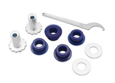 SuperPro's SPF5552K allows the addition of more negative camber at the front axle or the ability to fine tune and equalize camber on both sides of the car. Offering +/- 0.5 of on-car camber adjustment with the included tool this can be used on its own or in combination with a rear bushing/mount upgrade.