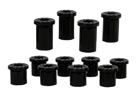 A critical service item for any leaf sprung vehicle. High kilometres and heavy load carrying causes excessive wear on rubber bushings. Whiteline's signature black bushings are made tough and offer outstanding abrasion resistance, high load bearing capability (4WD's, utes and towing), flexibility, increased tensile strength and chemical resistance to oil, grease, ozone and weathering.