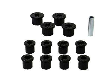 A critical service item for any leaf sprung vehicle. High kilometres and heavy load carrying causes excessive wear on rubber bushings. Whiteline's signature black bushings are made tough and offer outstanding abrasion resistance, high load bearing capability (4WD's, utes and towing), flexibility, increased tensile strength and chemical resistance to oil, grease, ozone and weathering.